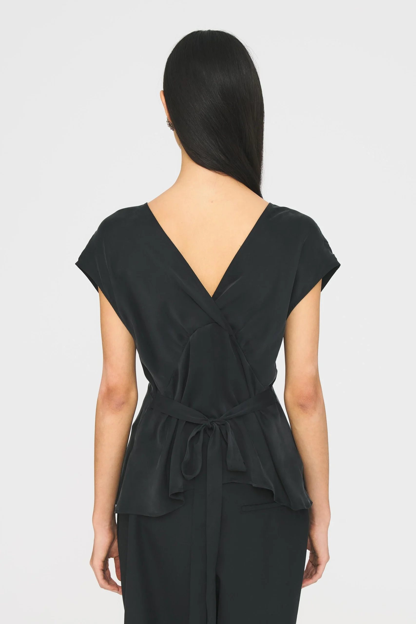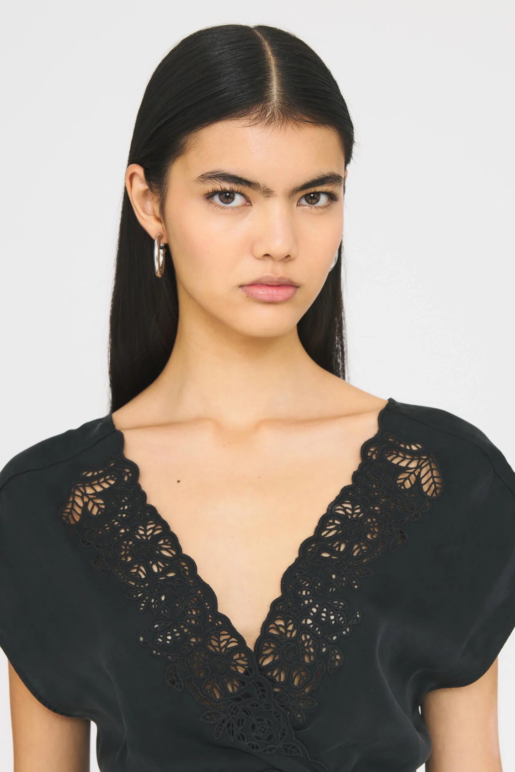 Top en crêpe de soie. Découpe du tissu effet dentelle sur l’encolure du top permettant de la transparence.