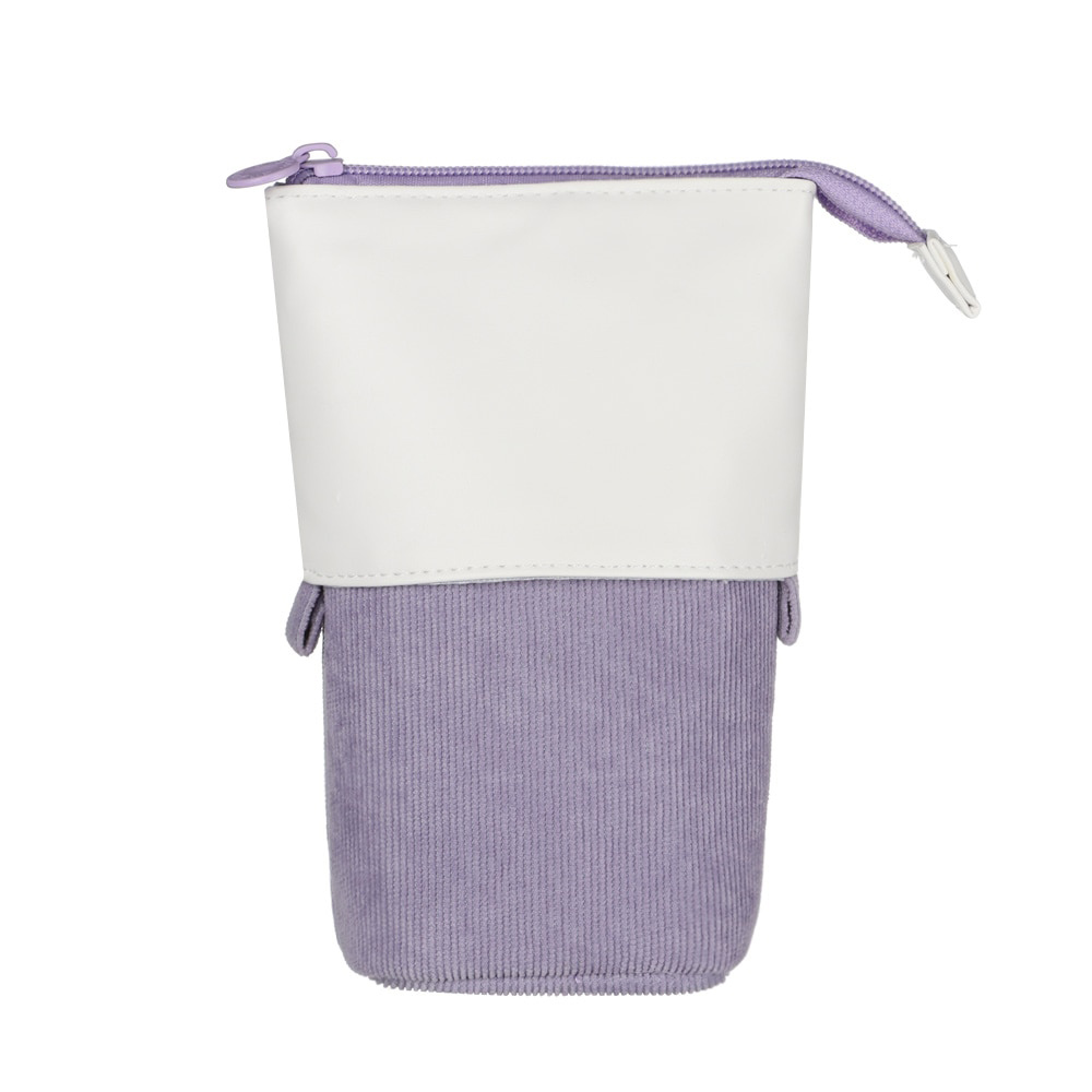 Voici une trousse Originale pour ranger vos crayons. En un coup de tirette, cette trousse pop-up cuir violette se transforme en un pot à crayon.