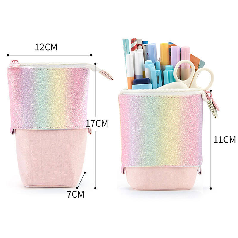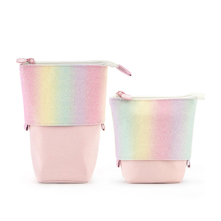 Voici une trousse Originale pour ranger vos crayons. En un coup de tirette, cette trousse rétractable arc en ciel rose se transforme en un pot à crayon.