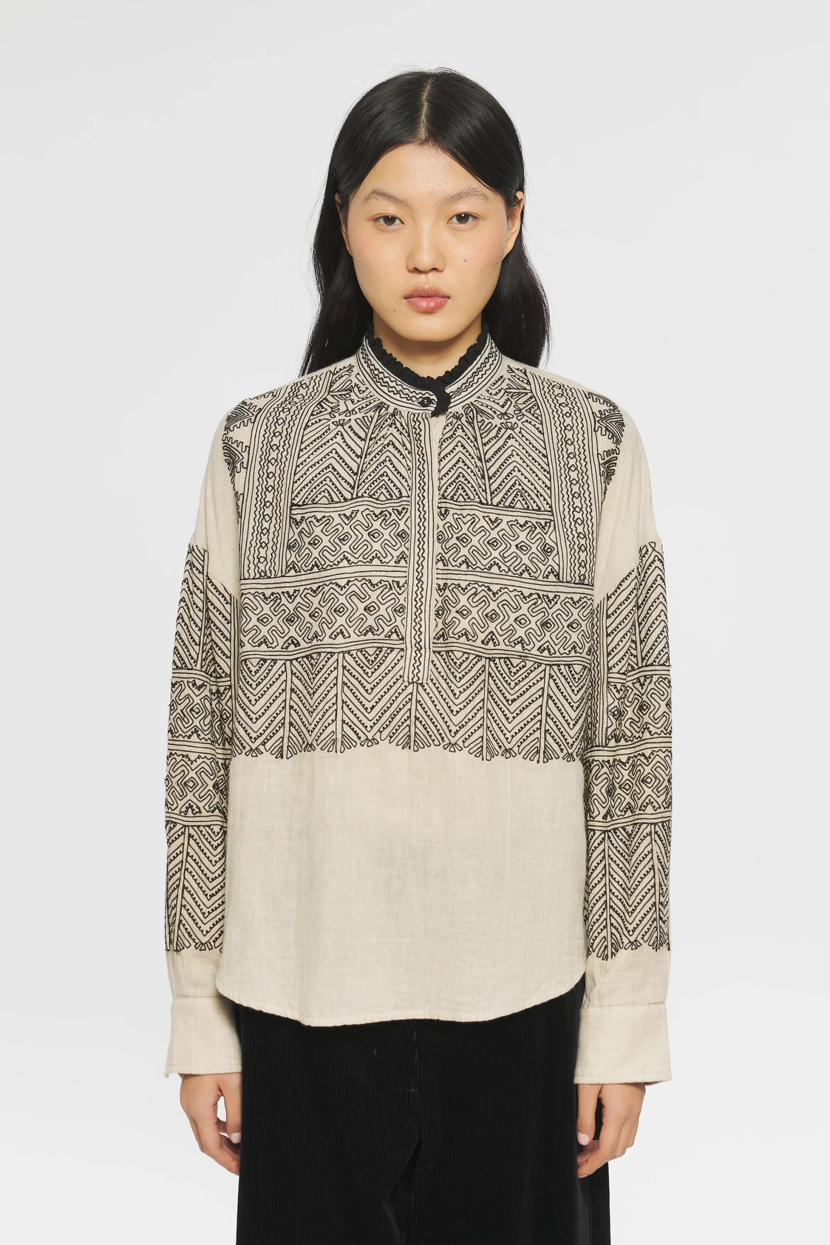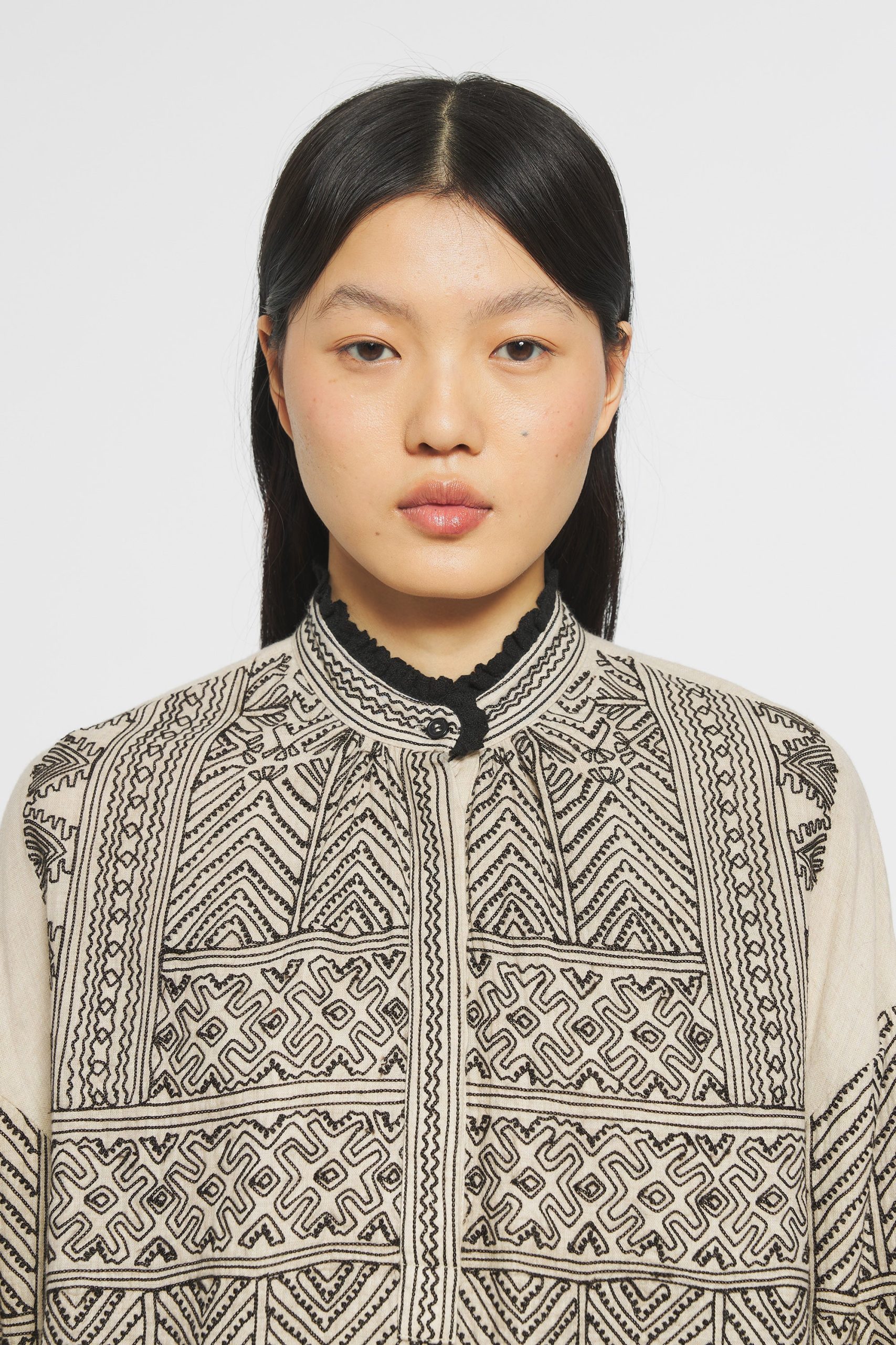 Tunique en double gaze de coton. Broderies géométriques et artisanales. Ruban en coton inséré au niveau du col.
