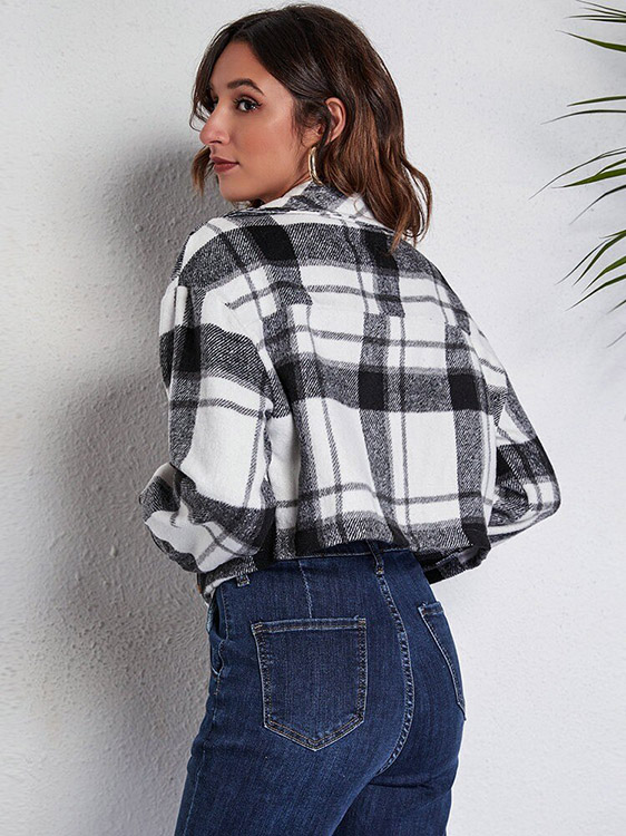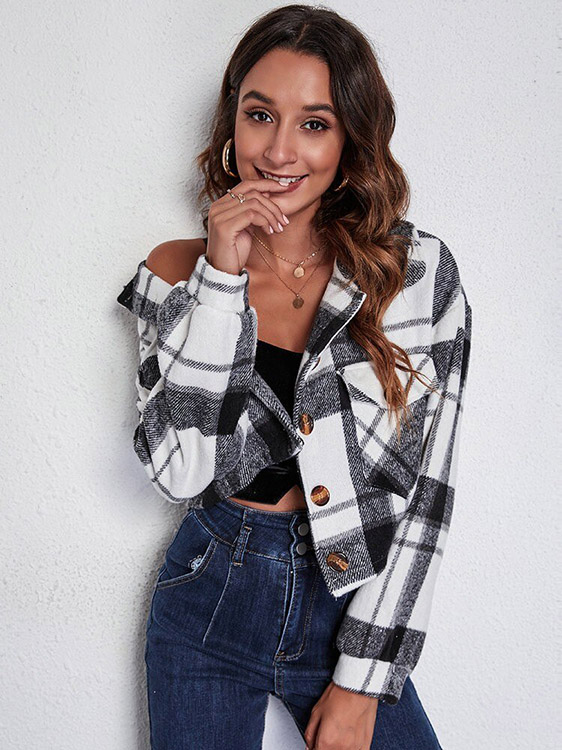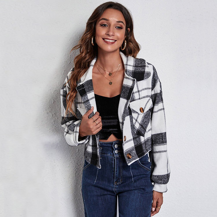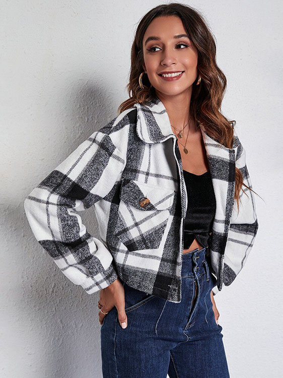Veste blanche et noire à carreaux, col chemise, fermeture boutonnée, deux poches sur le côté, coupe courte, toucher doux, manches longues. Base droite.
