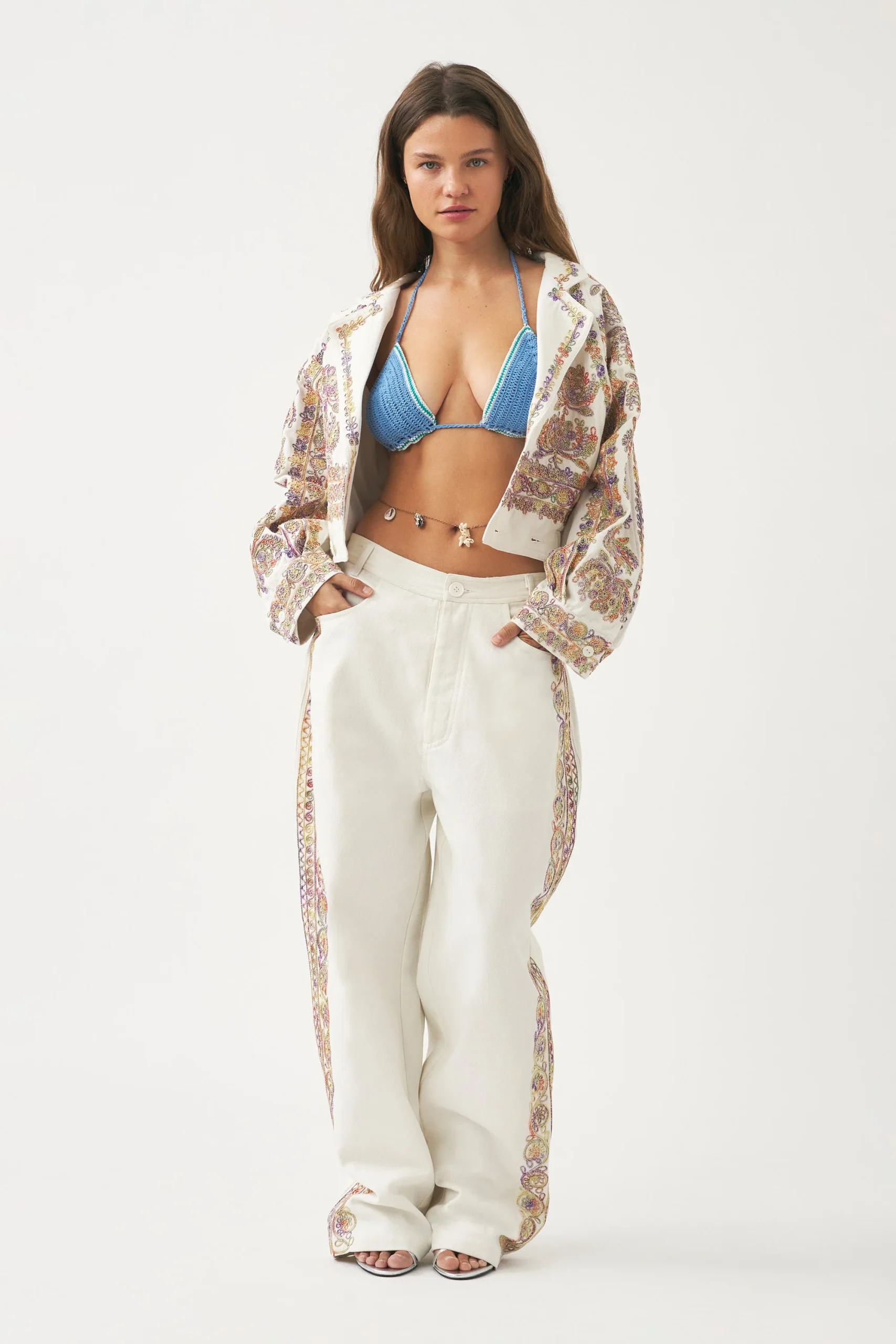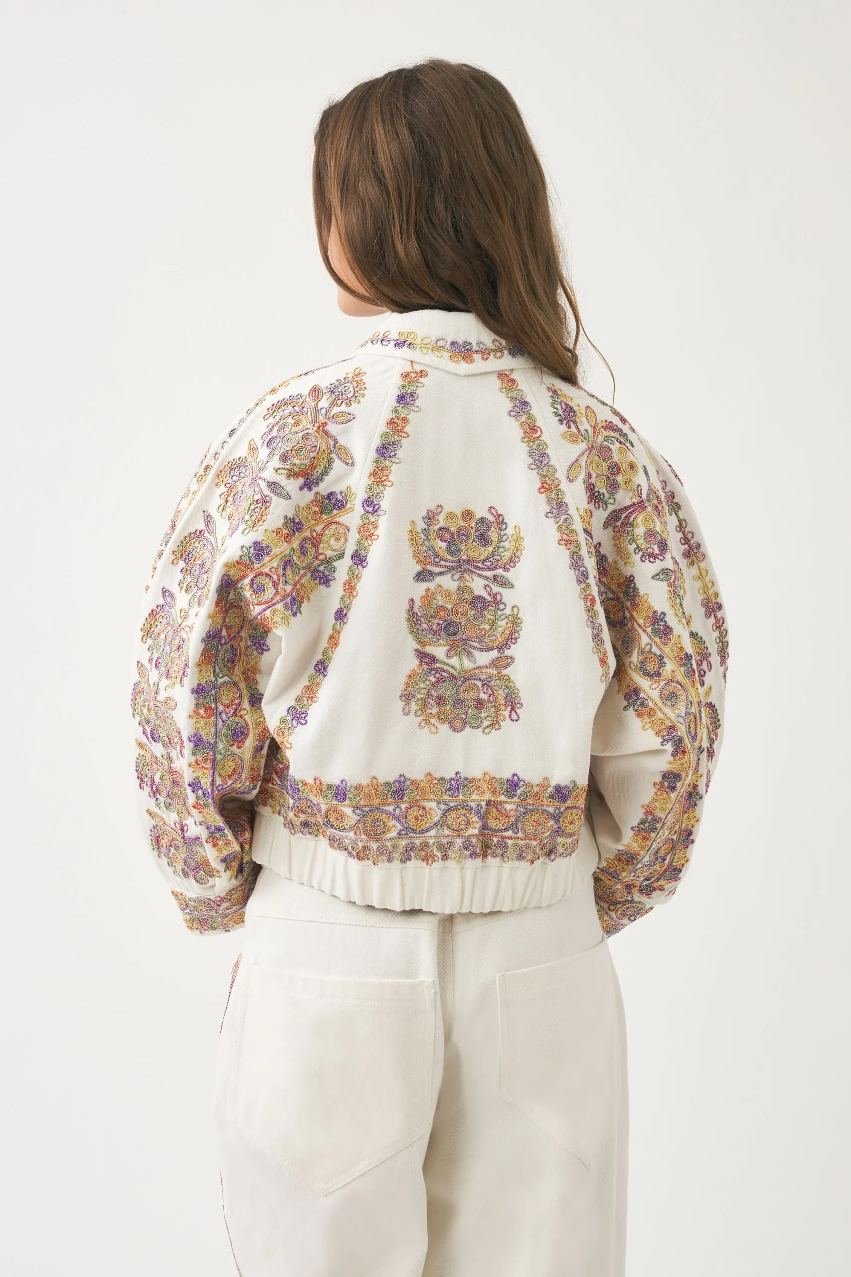 Veste en twill de coton brodé. Broderies cousues main en coton all-over tie and dye. Veste croisée. Fermeture par un bouton. Elastique au bas du dos. Manches raglan. Deux poches. Doublure en coton.