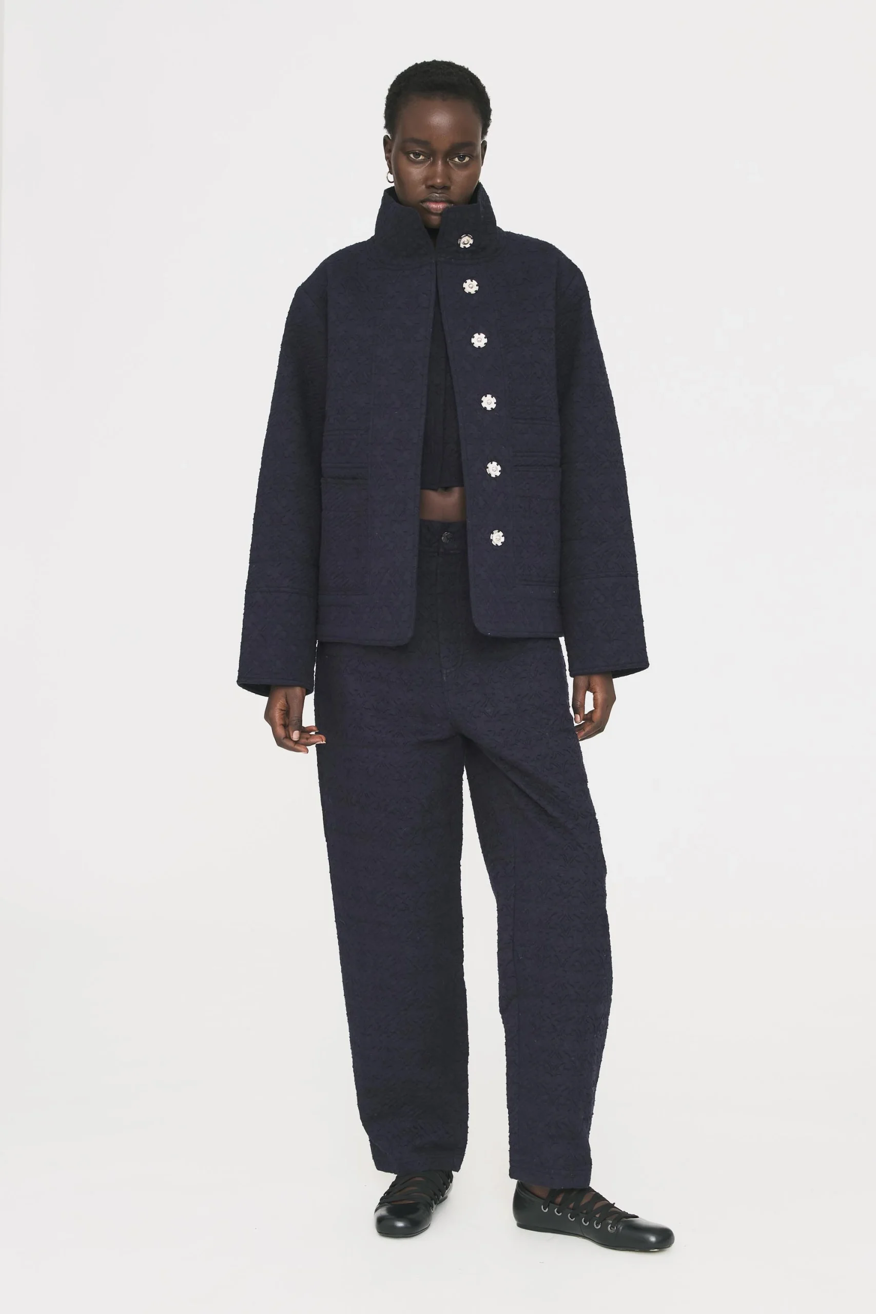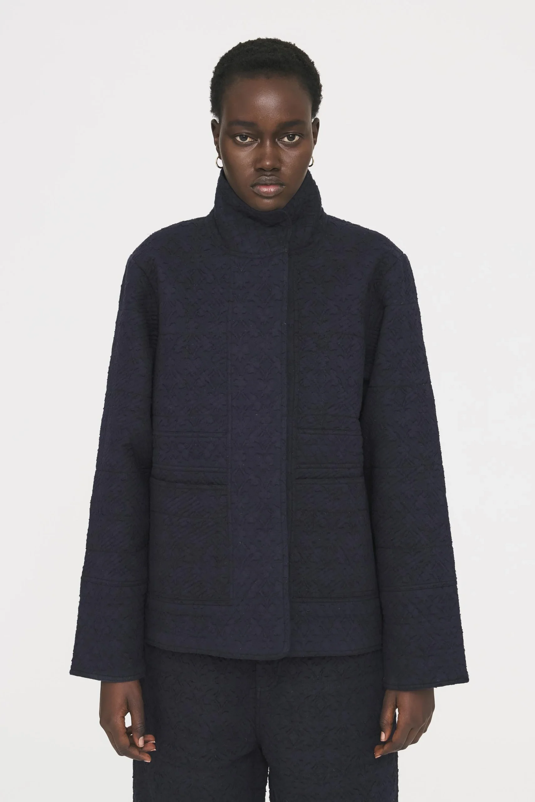 Veste en jacquard de coton quilté et surpiqué. Col montant. Doublure en coton. Fermeture à boutons pression.