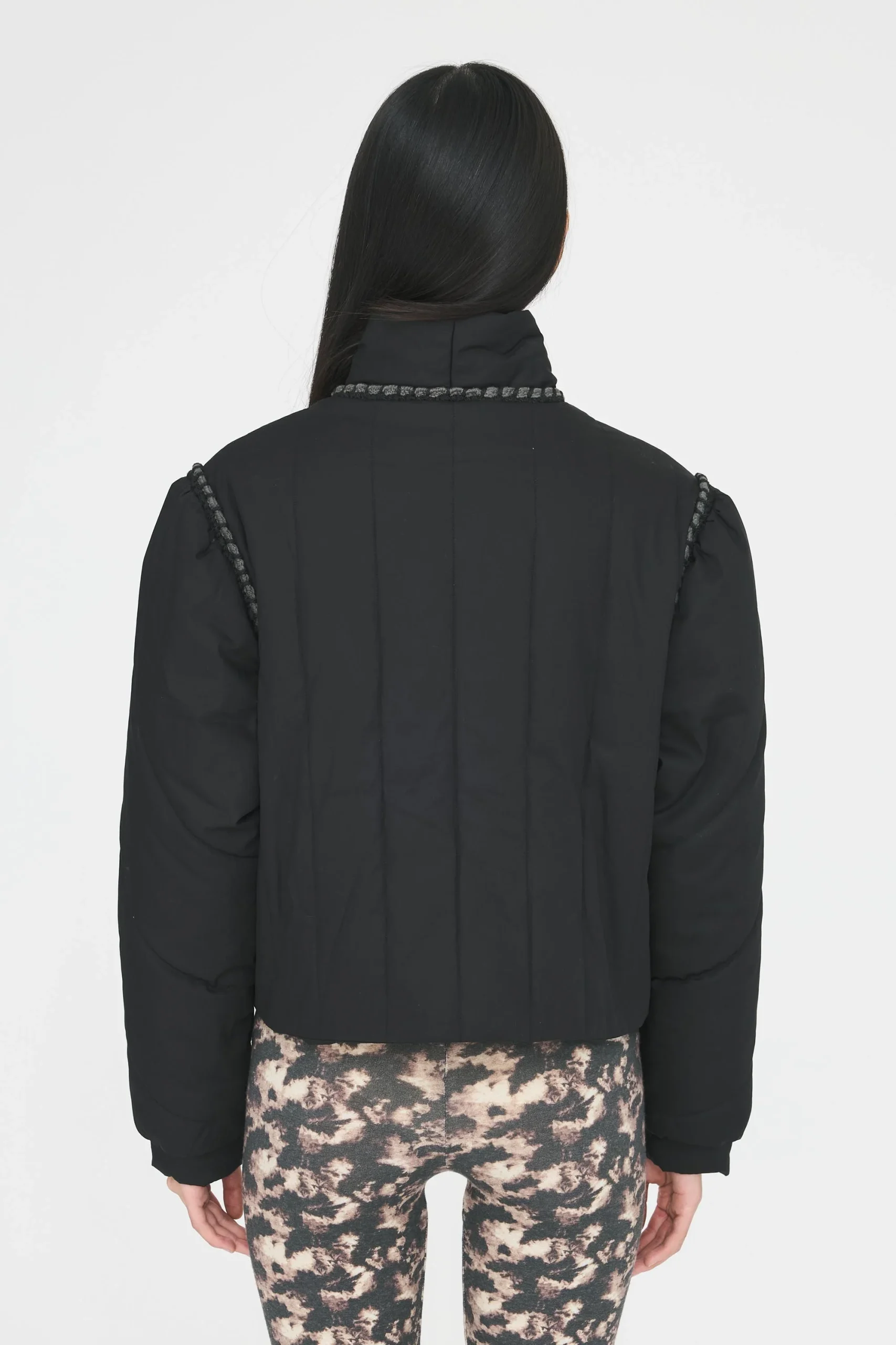 Veste courte rembourrée et quiltée en coton. Ruban de coton brodé à l’encolure, devant et aux emmanchures. Fermeture éclair. Deux poches droites. Doublée.