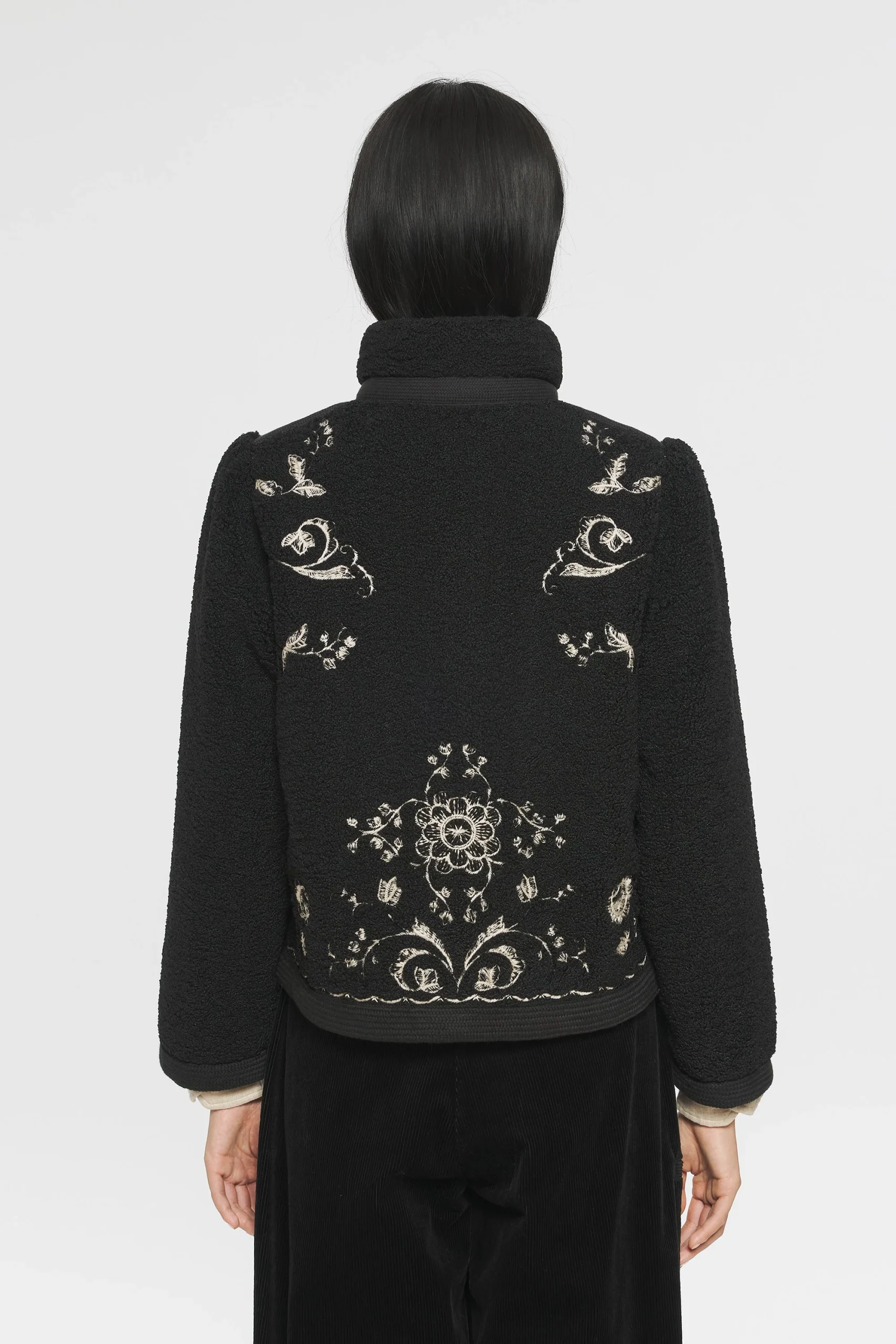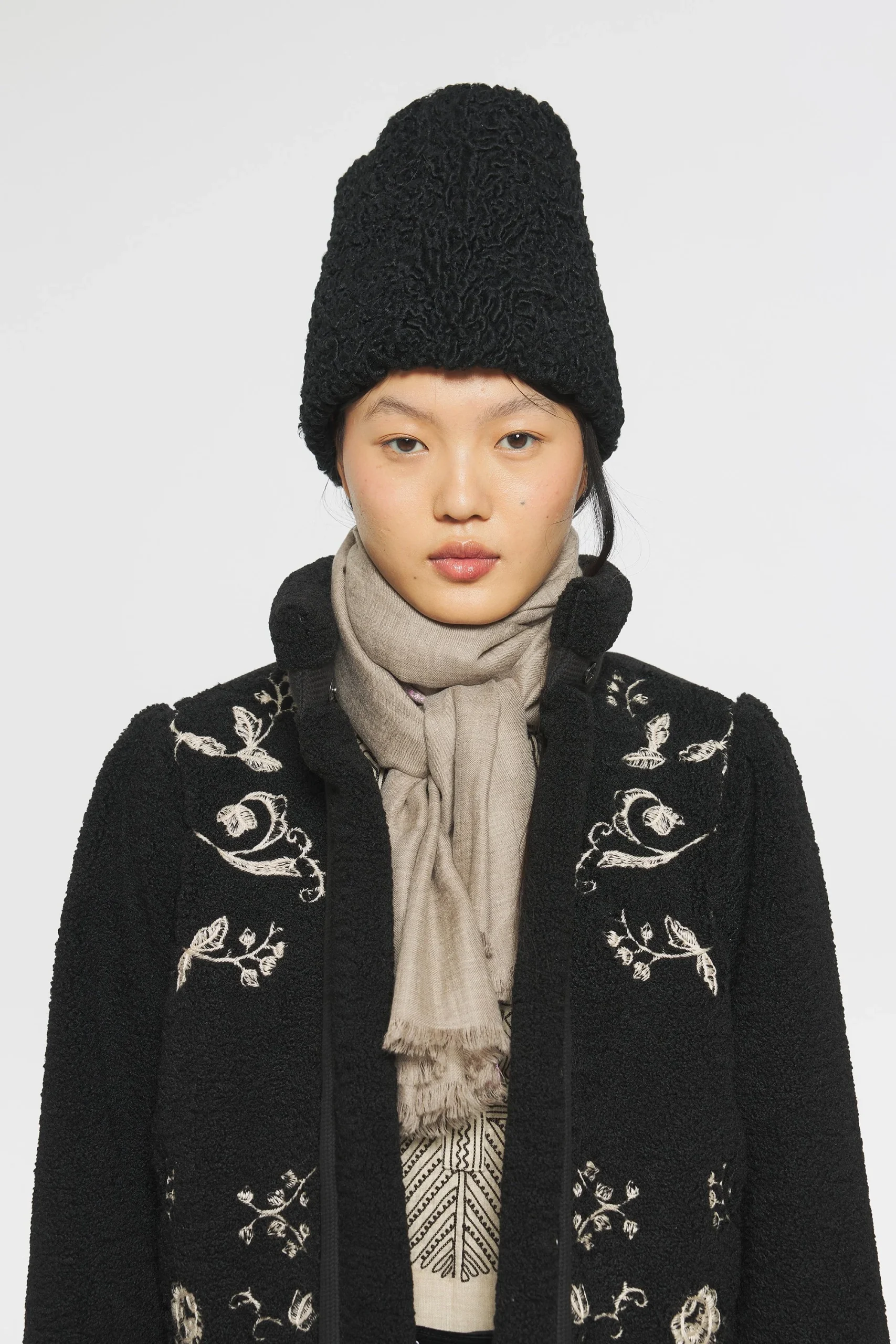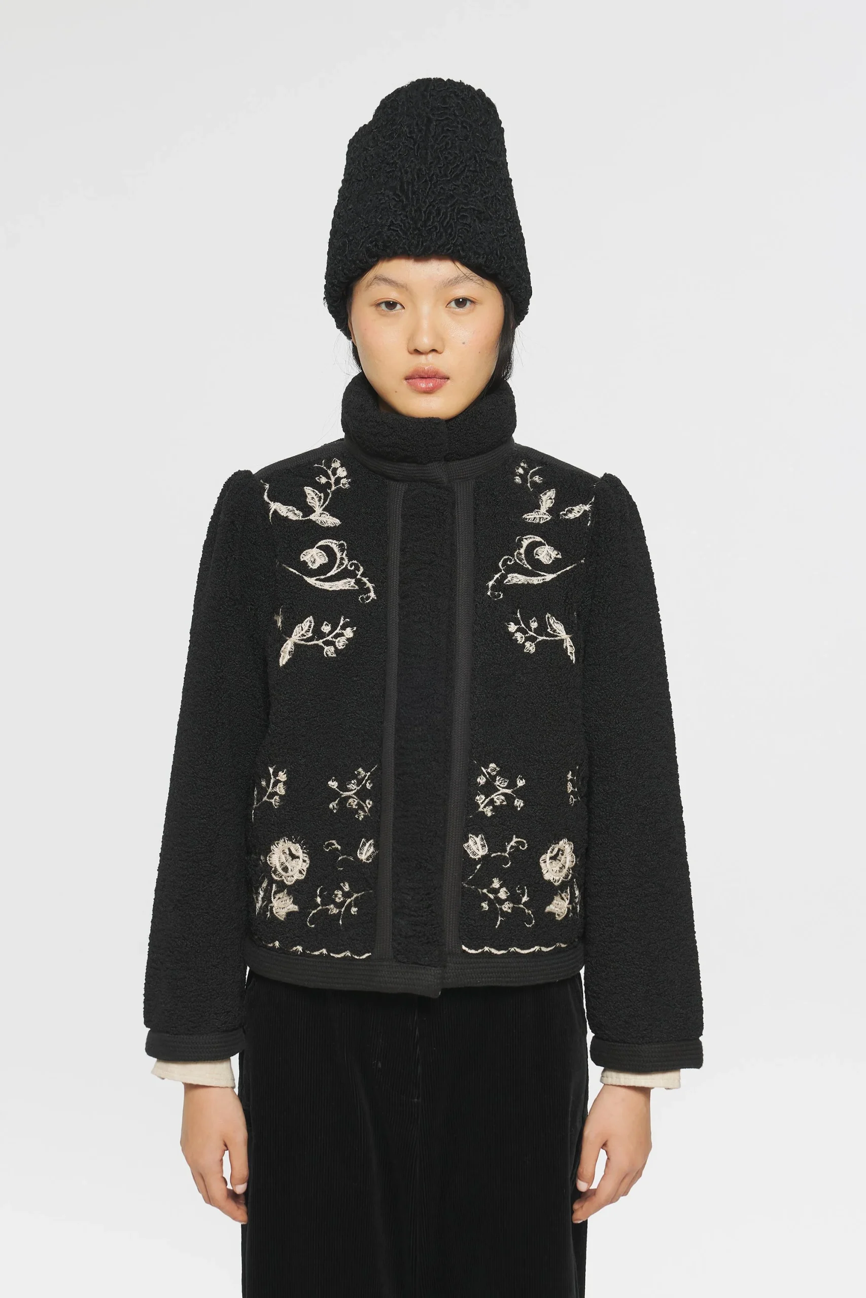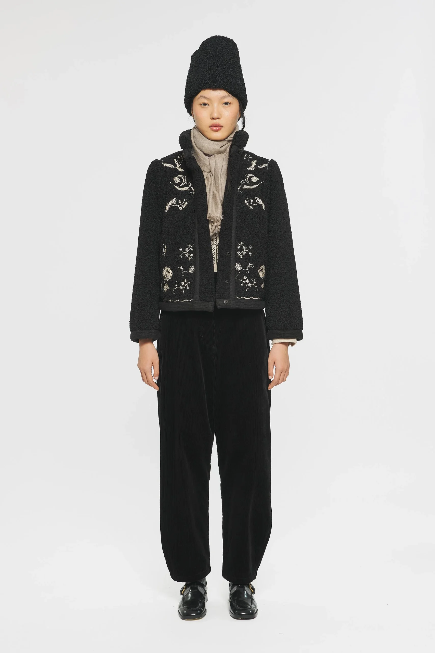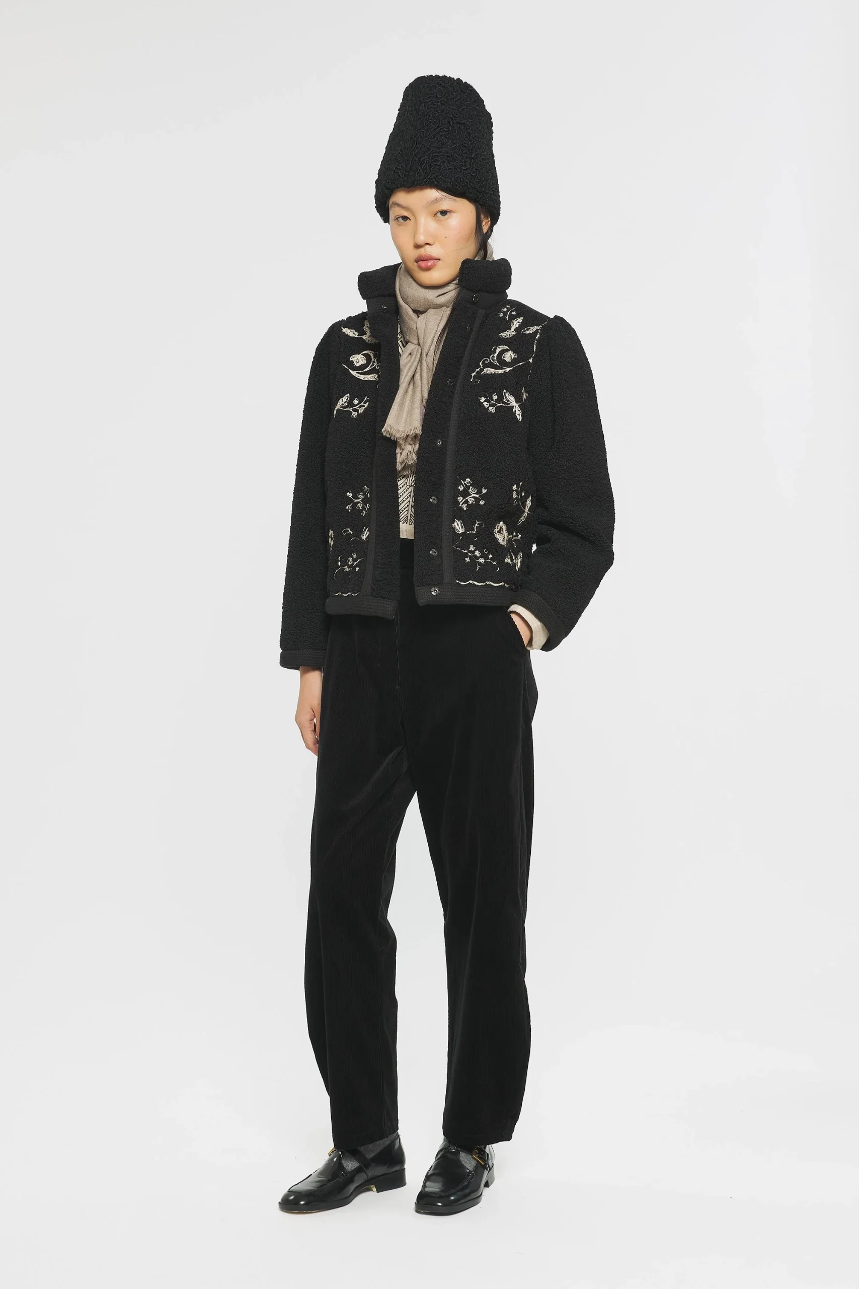Veste en fausse fourrure . Broderies artisanales sur le devant et dans le dos. Veste reversible. Galons en coton appliqués sur l’ensemble. Fermeture boutons-pression.