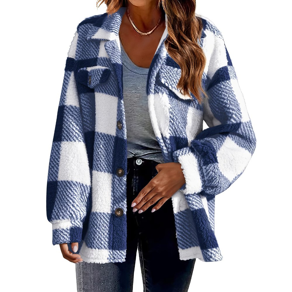 Apportez une touche de fraîcheur à votre garde-robe avec cette veste écossaise bleu et blanc. Avec son col rabattu et ses boutons, elle est dotée d’une élégance discrète.