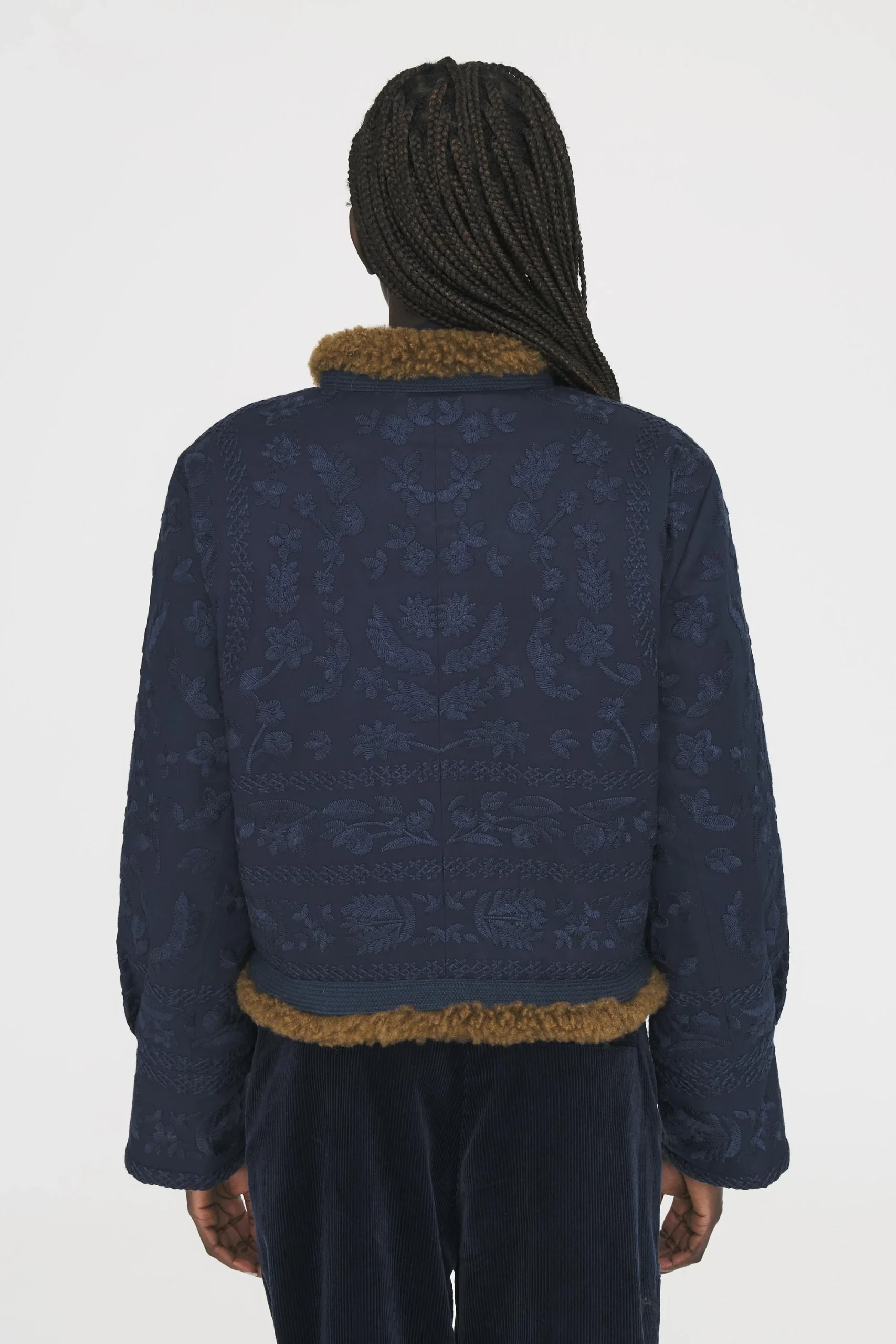 Veste brodée d’inspiration afghane. Broderies florales artisanales sur l’ensemble de la veste. Finitions en fourrure d’agneau ton sur ton. Doublure ultra-douce. Fermeture crochets.