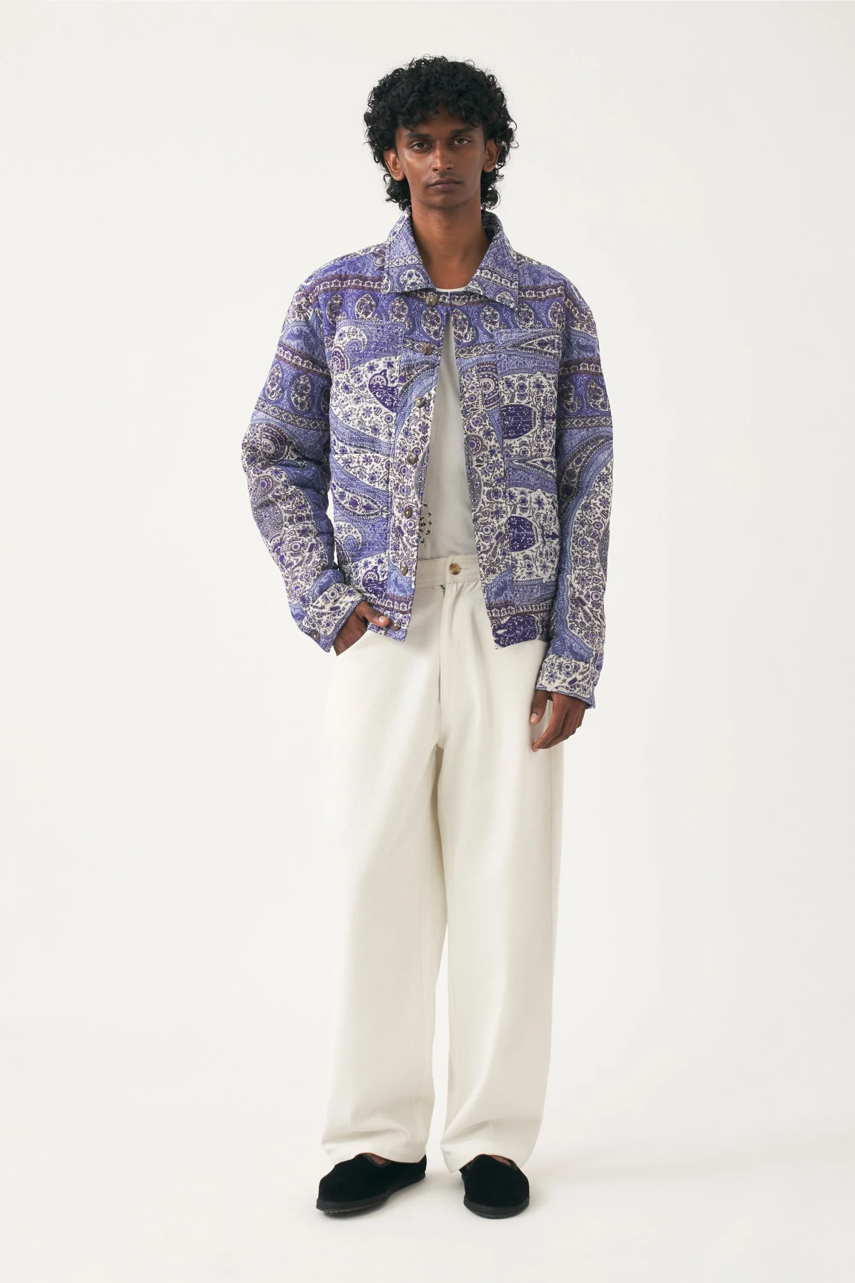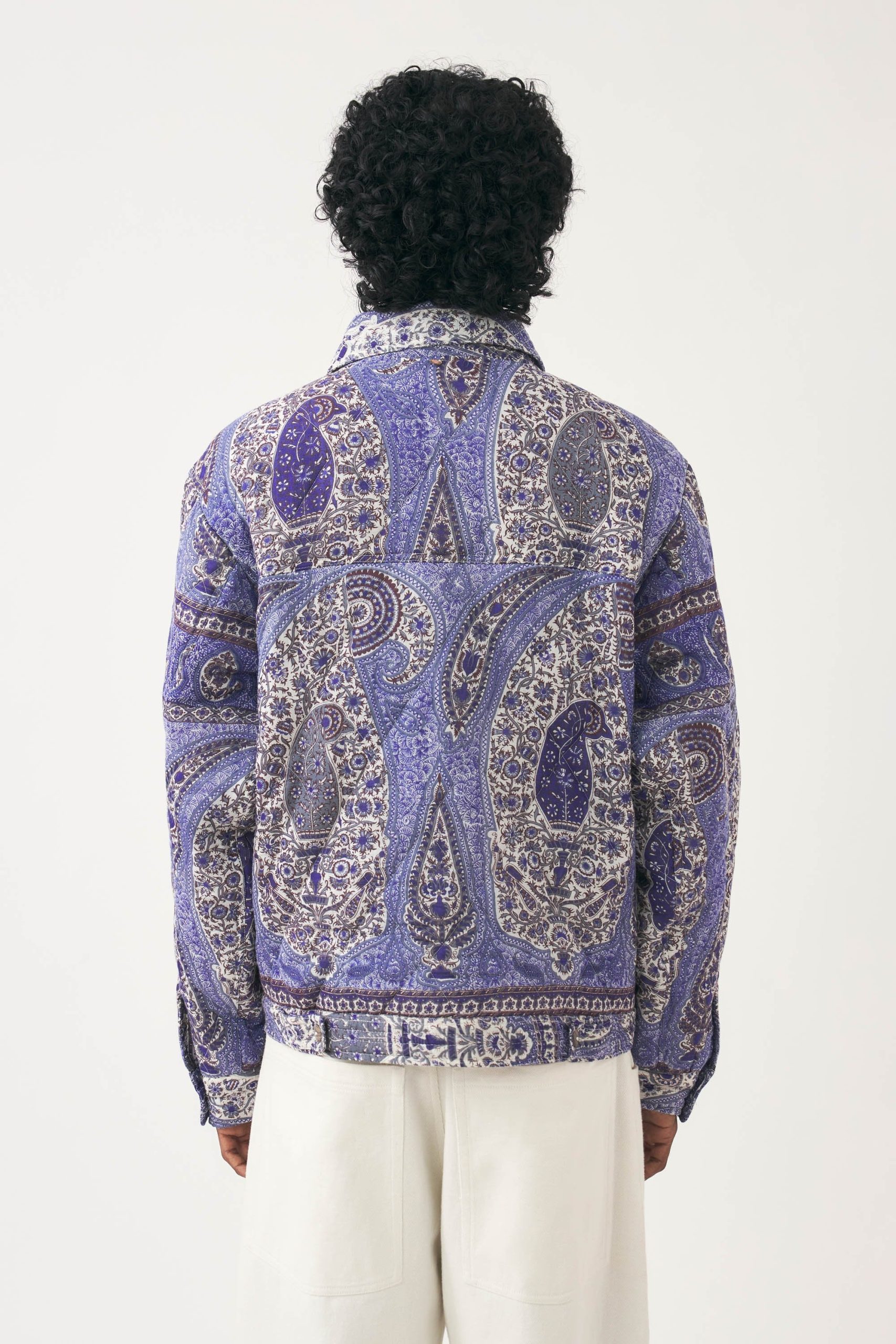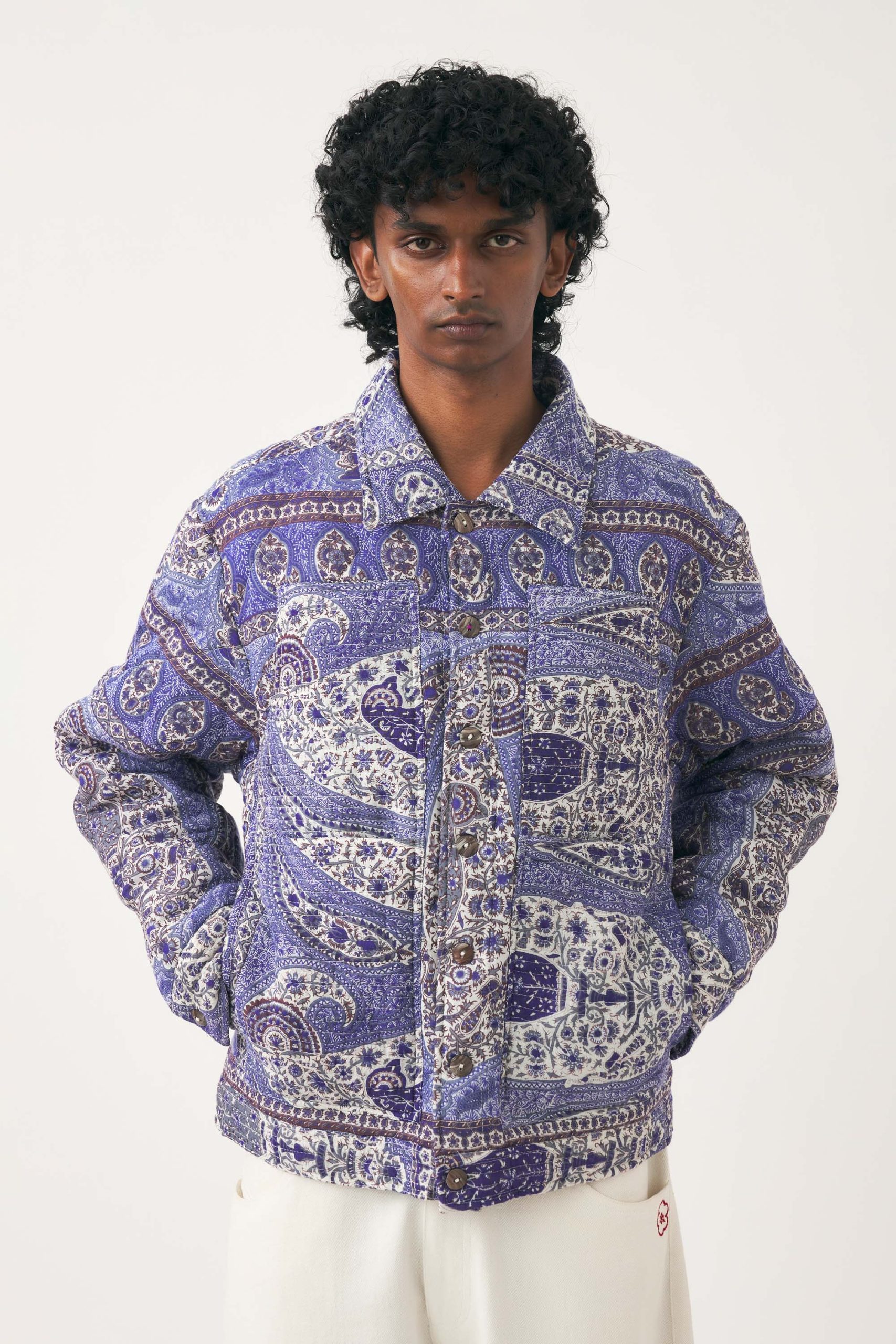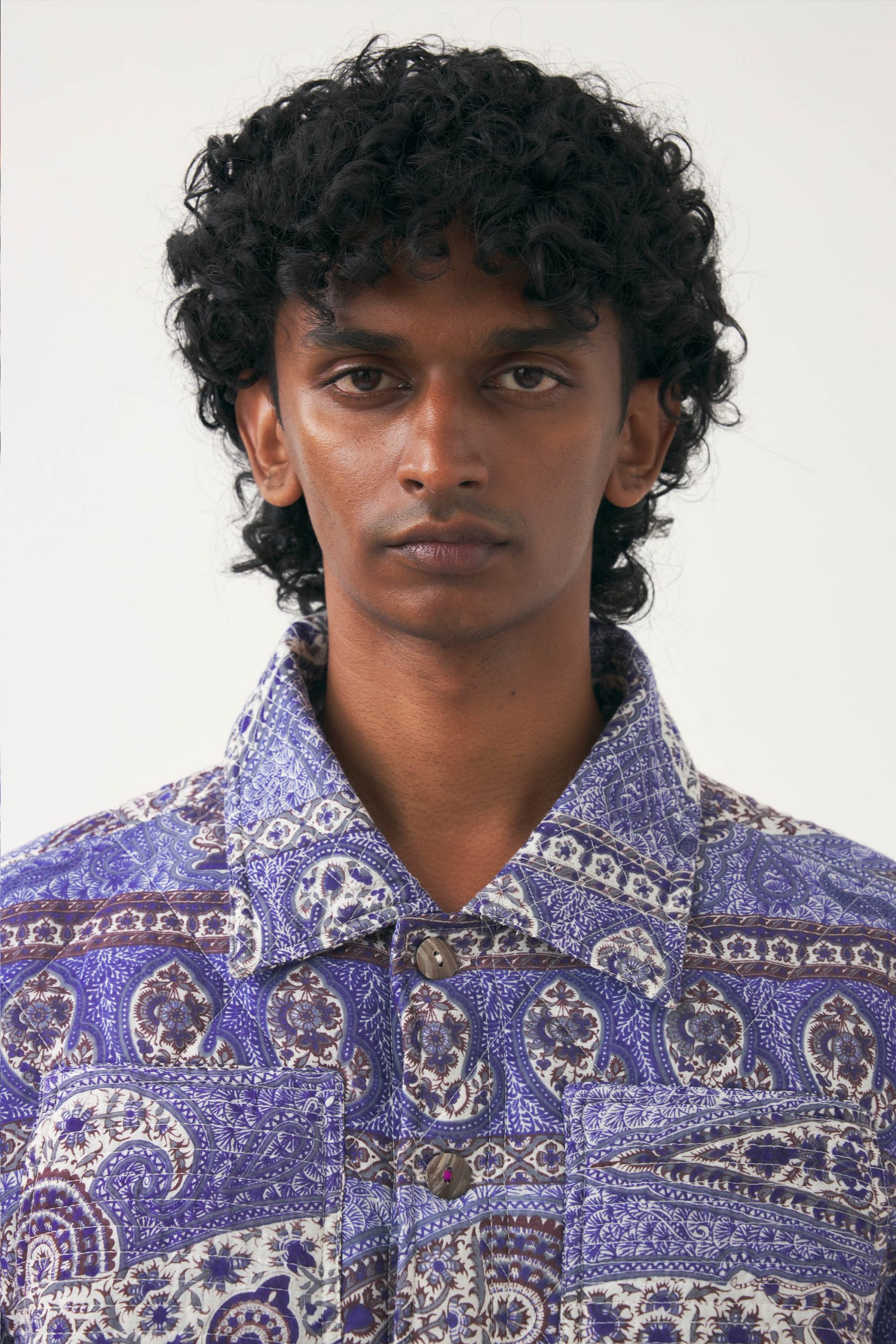 Veste en voile de coton imprimé. Imprimé dessiné dans notre atelier parisien puis appliqué à la main sur le tissu selon la technique du block print (savoir-faire artisanal indien). Boutons sur le devant et aux poignets.