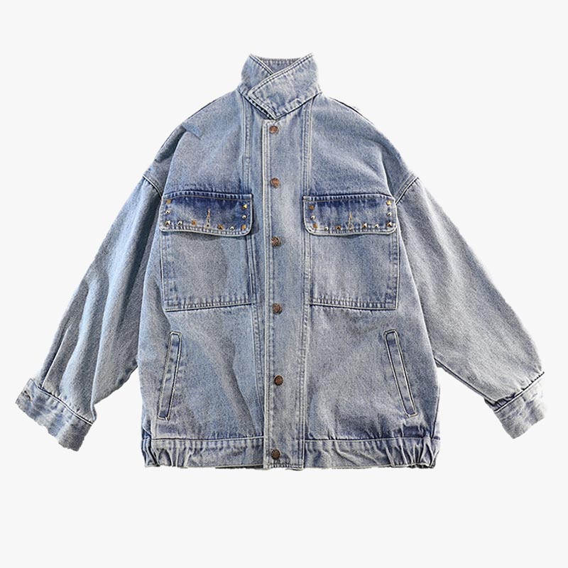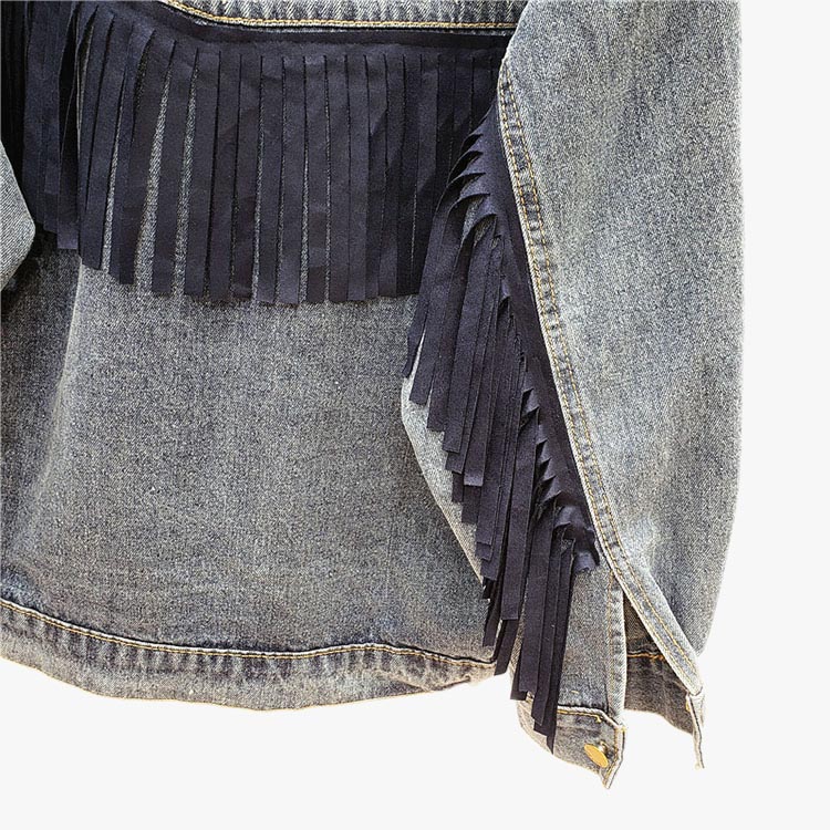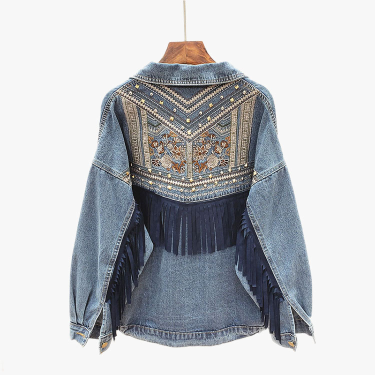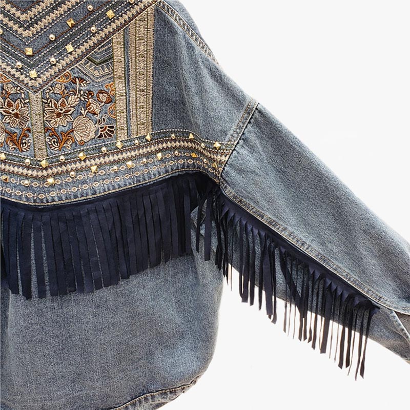 On adore son design Oversize fashion, les fleurs brodées, les clous et les franges en cuir bleues. Autant de détails qui ajoutent une touche décontractée à cette veste en jean très chic.