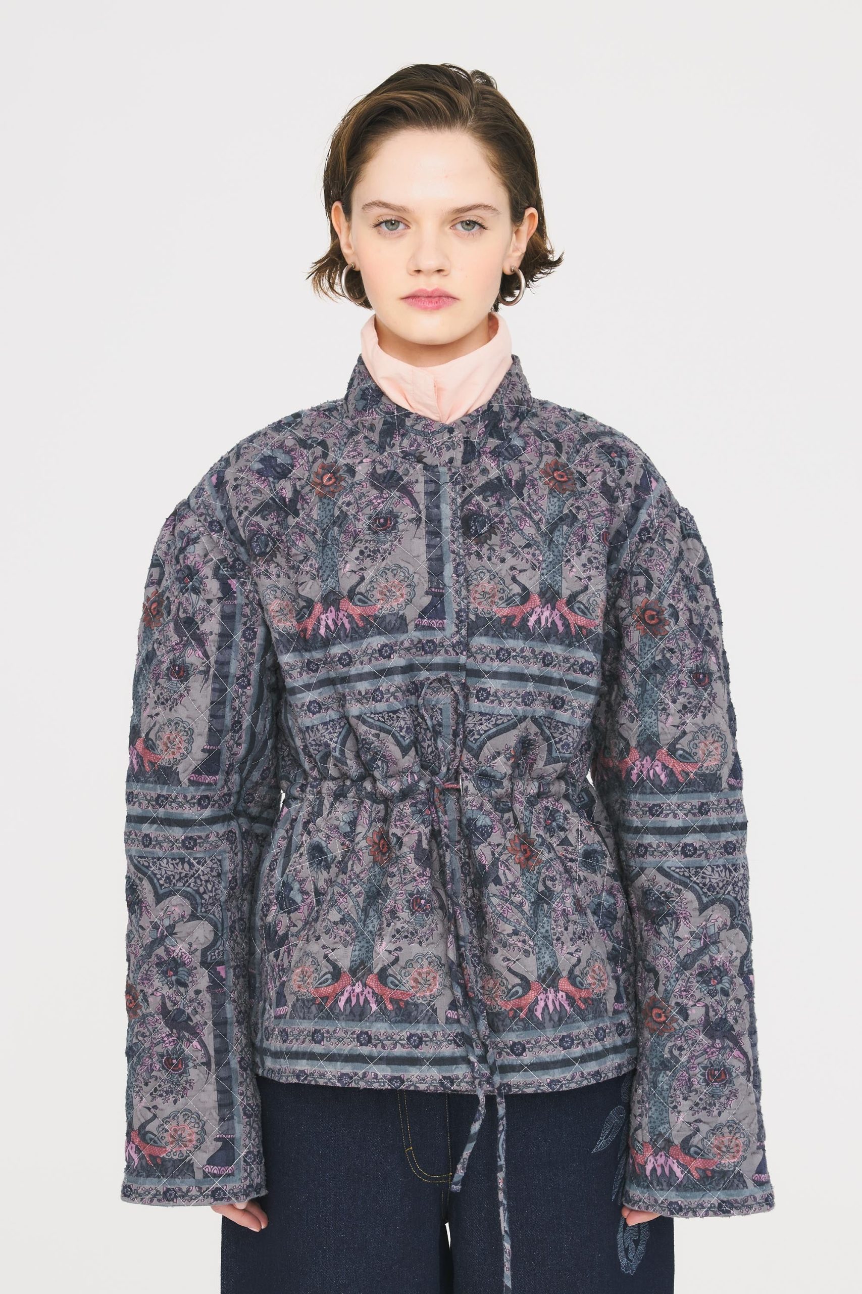 Veste en jacquard de coton imprimé avec surpiqûres. Doublure en coton à imprimé contrasté. Fermeture à boutons-pression. Deux poches latérales sur le devant. Lien amovible cousu à l’intérieur de la veste. Col légèrement montant.