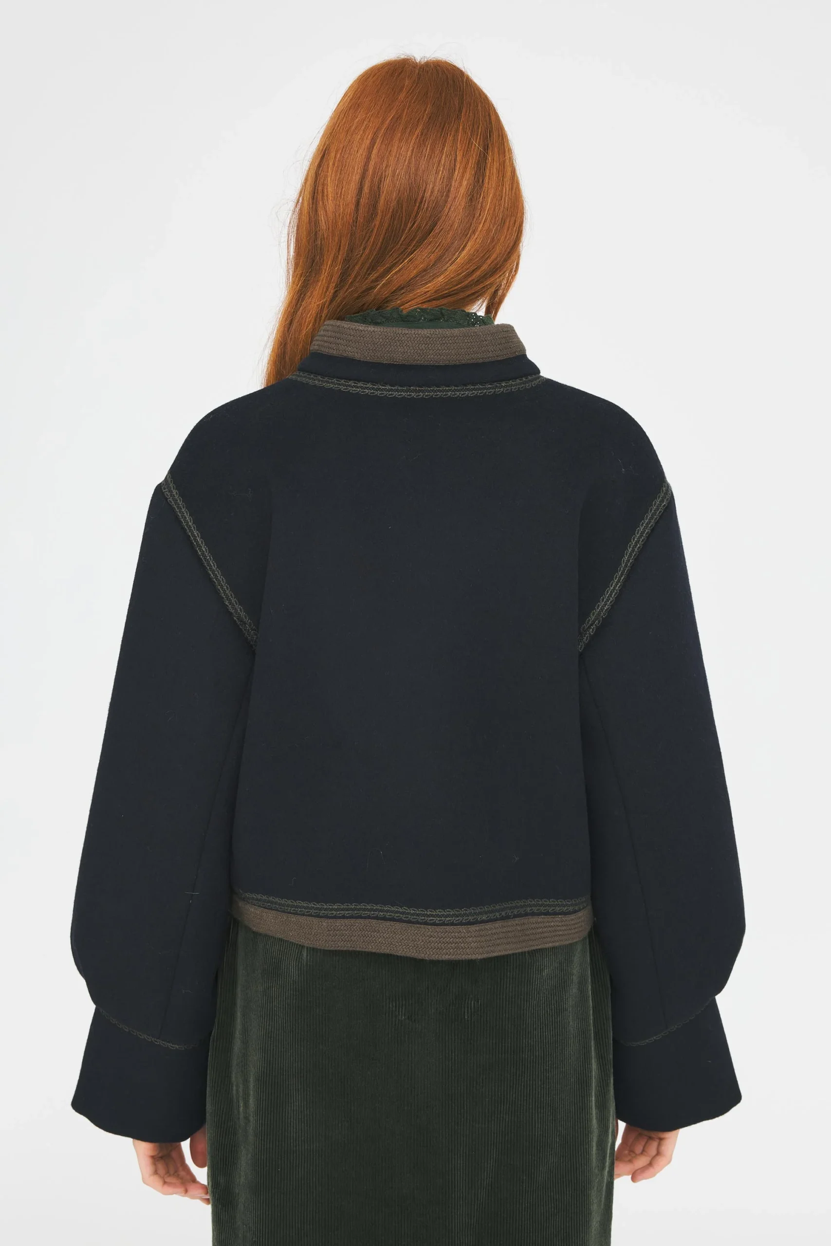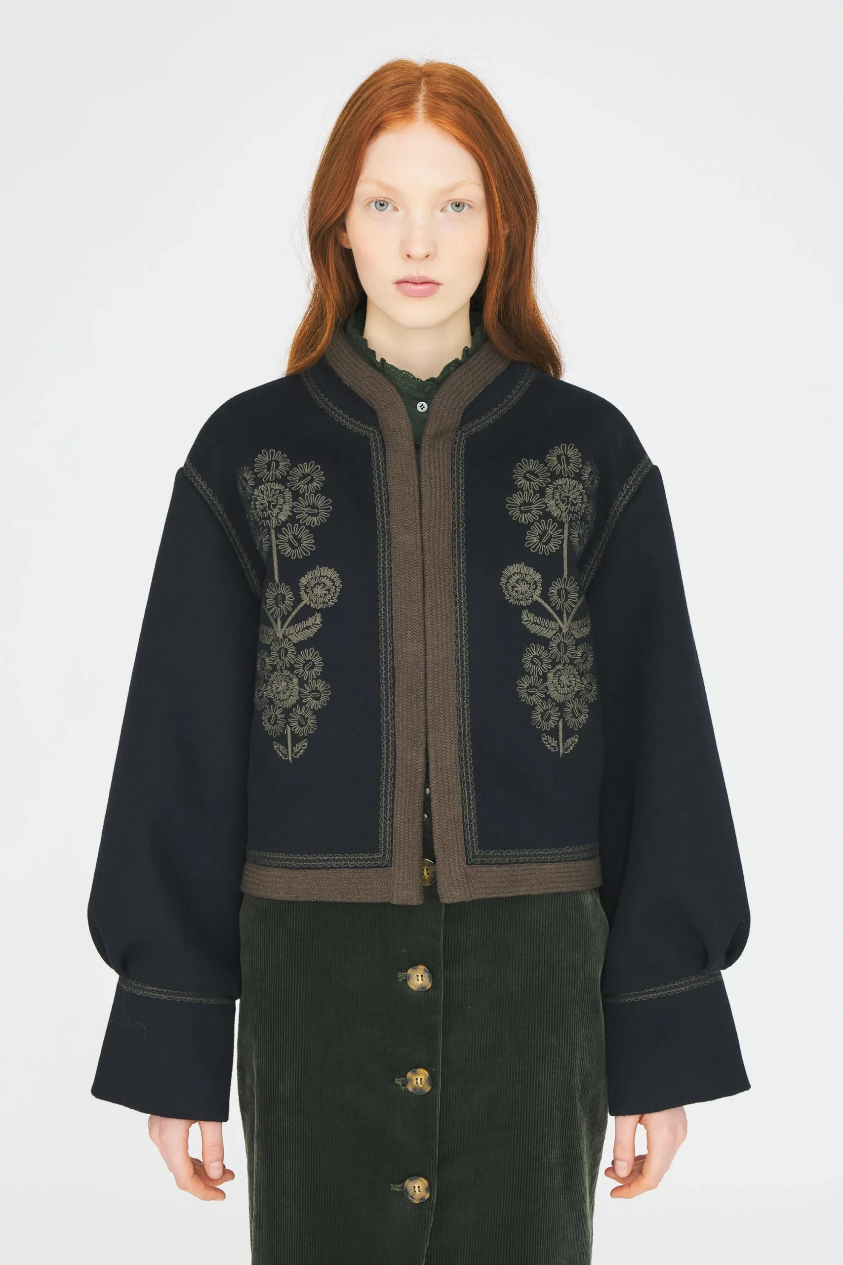 Veste courte brodée laine mélangée. Broderies florales artisanales sur l’ensemble du gilet. Finition des bords avec galon. Fermeture à agrafes. Doublée.