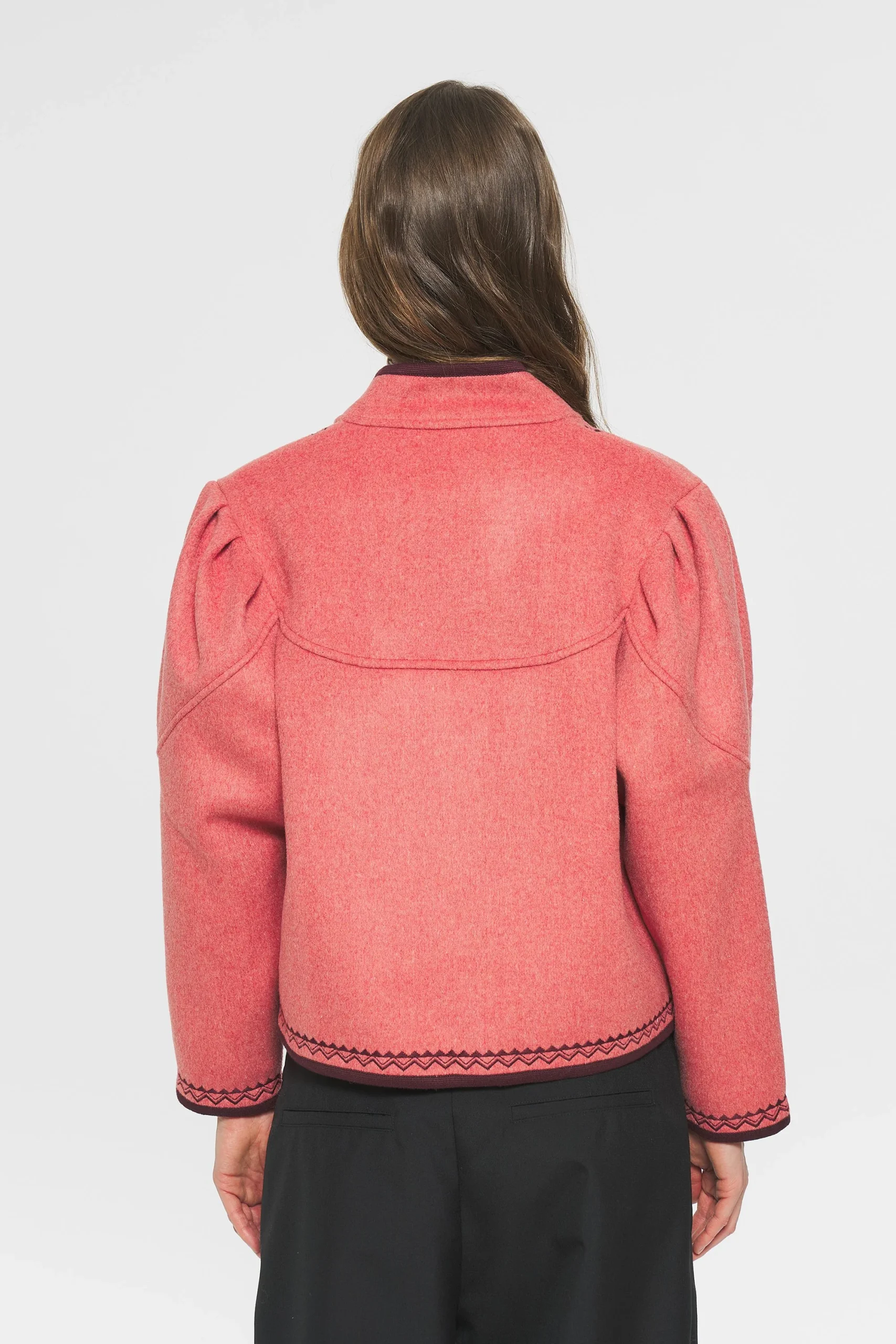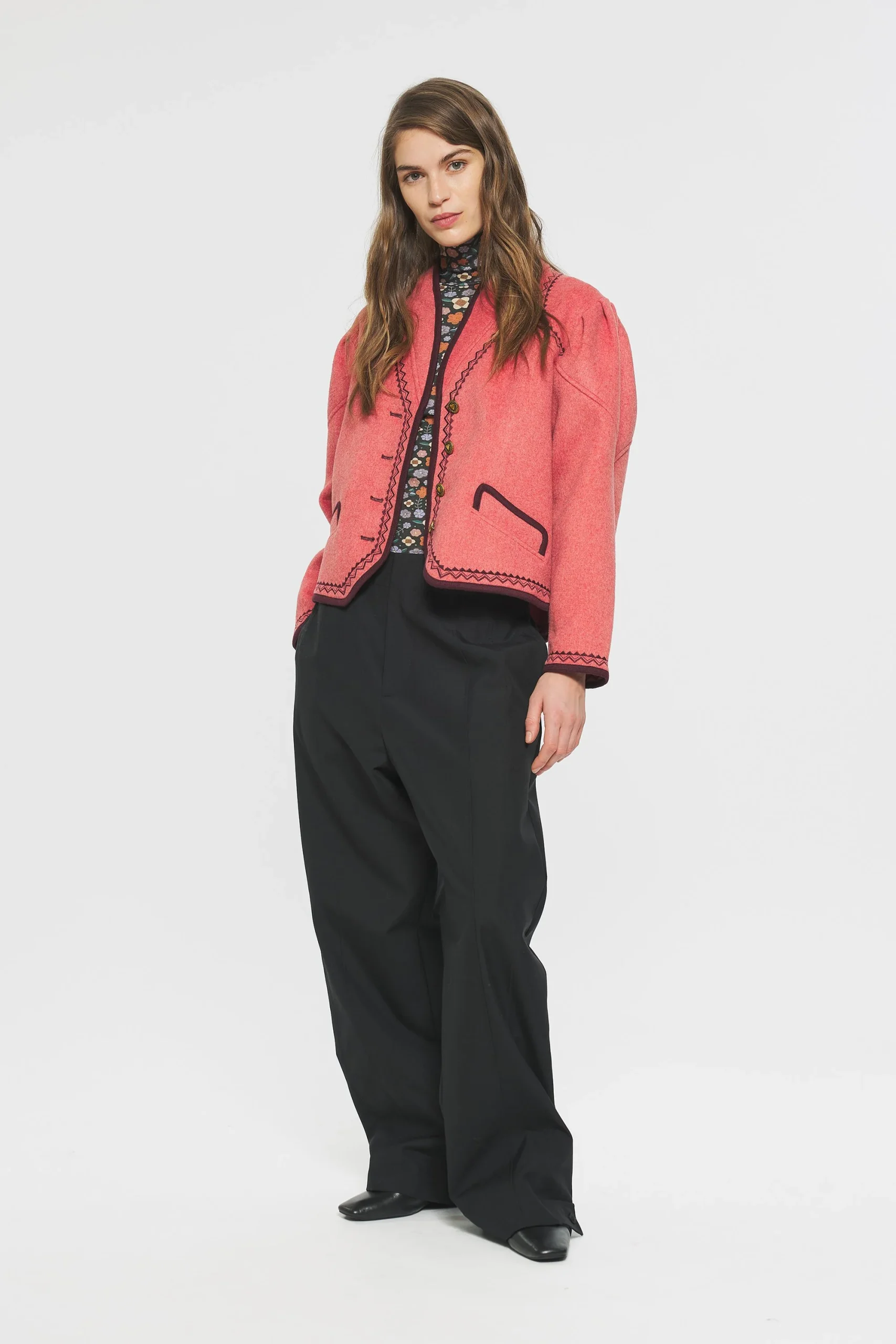 Veste en laine. Broderies artisanales. Deux poches latérales situées sur le devant du manteau. Froncées aux épaules. Veste brodée et galons à l’encolure, aux épaules et aux poches.