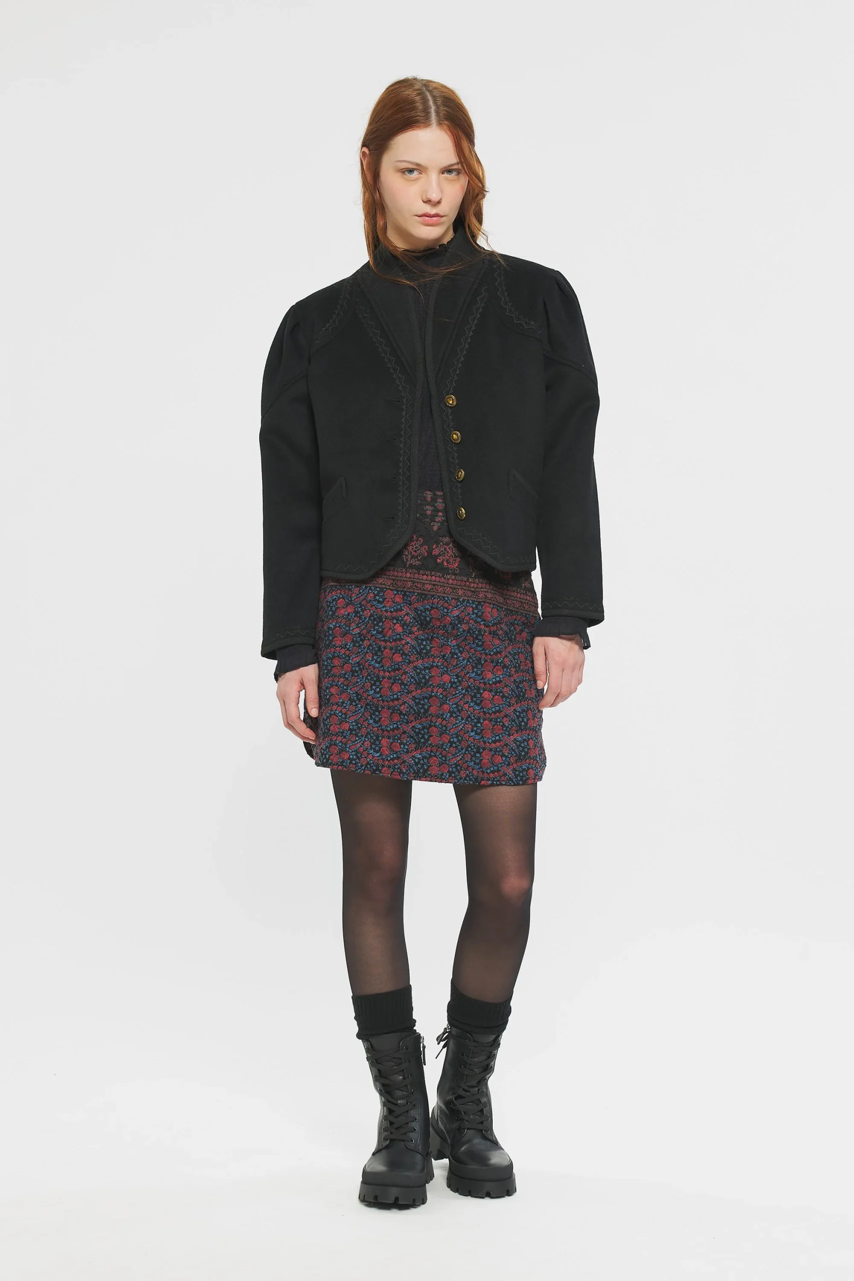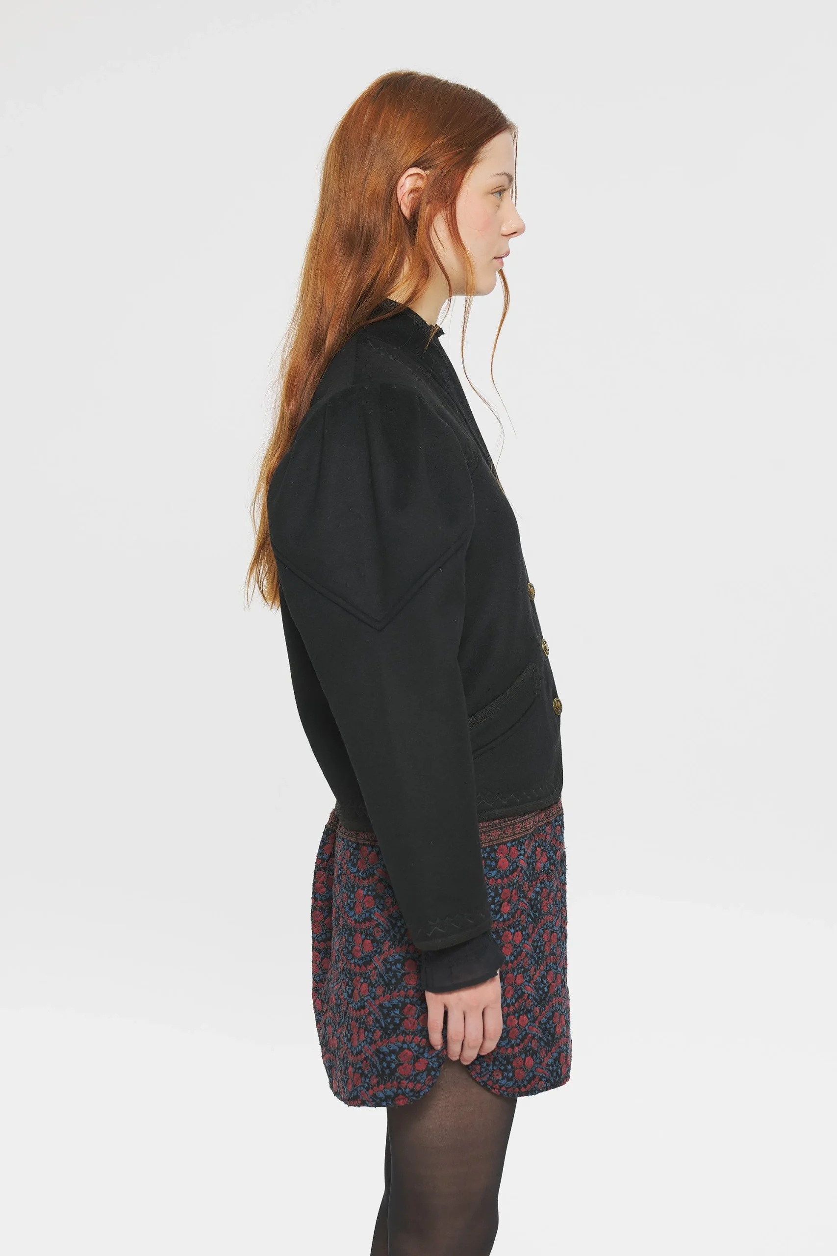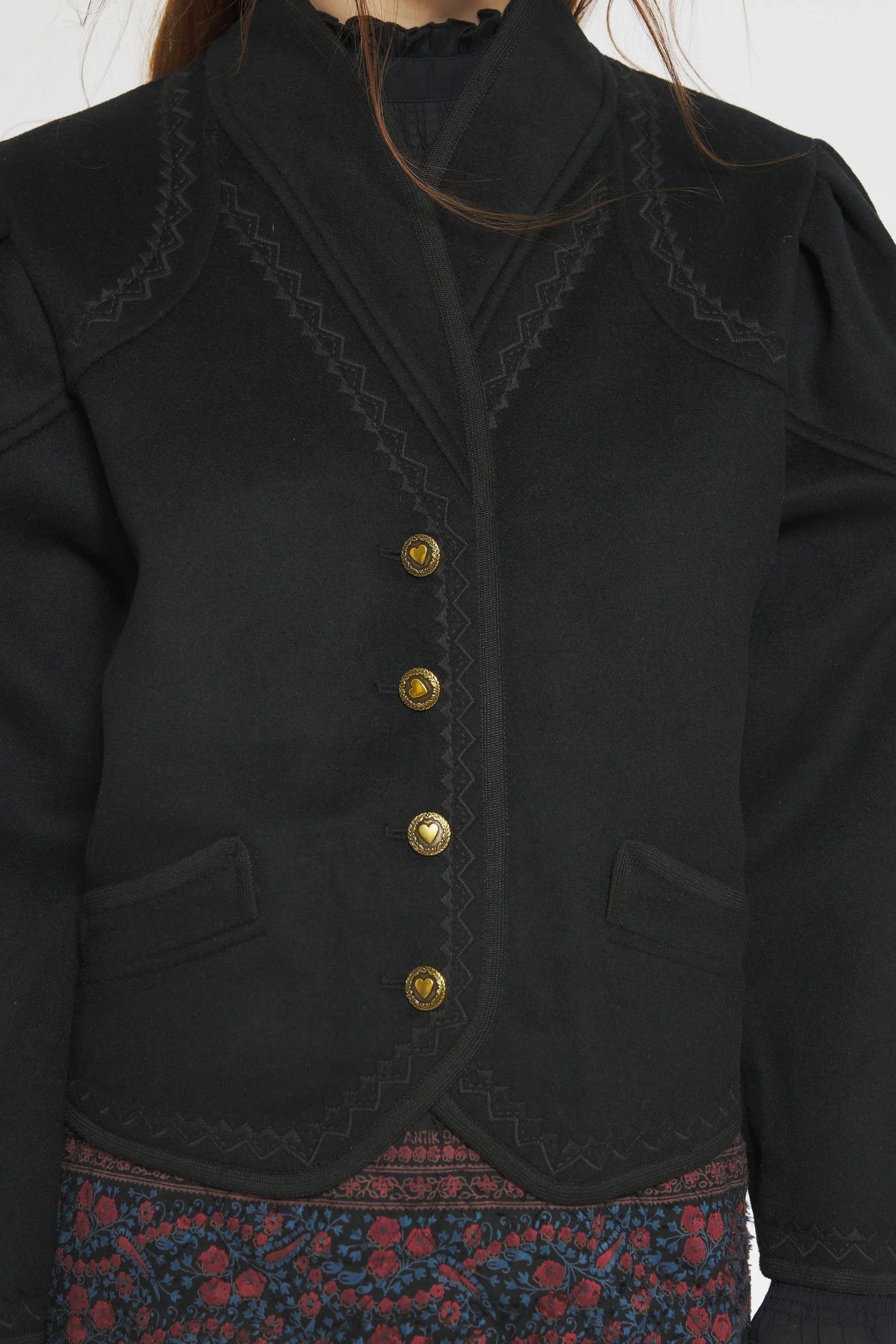 Veste en laine. Broderies artisanales. Deux poches latérales situées sur le devant du manteau. Froncées aux épaules. Veste brodée et galons à l’encolure, aux épaules et aux poches.